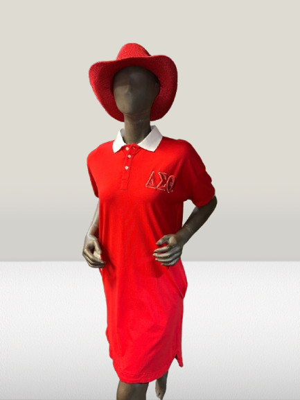 Make a bold statement with this classic red polo dress featuring Delta Sigma Theta's iconic Greek letters. This sophisticated piece combines the timeless appeal of polo styling with sorority pride, making it perfect for chapter events, professional occasions, or any time you want to represent your sisterhood with elegance and style.