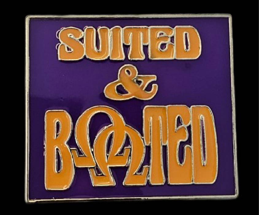 Suited and Booted Lapel Pin. Larger pin, measures 1.75" wide x 1.5" tall. Double clasp on the back to keep is squared up. Gold plated enamel. High quality. While supplies last.
