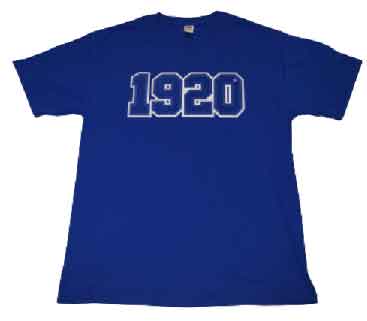 1920 embossed chenille securely sewn onto the garment. This will not be flopping in the wind after a few washes. Purchase with confidence. Typically printed on Gildan Tees.